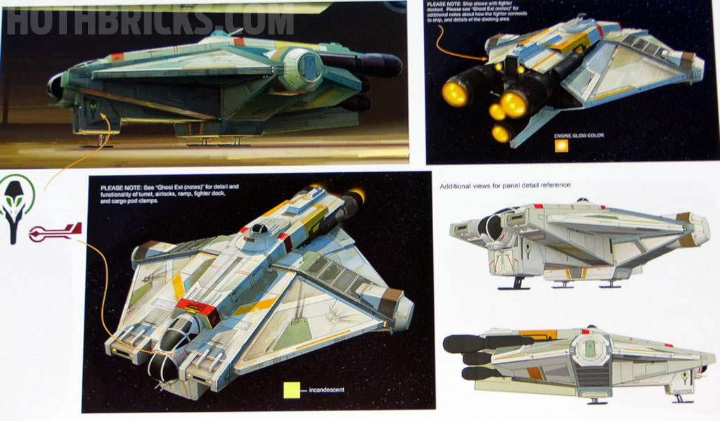 75053 The Ghost : "...Get ready to battle the Empire with the Rebel heroes' awesome starship – The Ghost – as seen in the thrilling Star Wars: Rebels animated TV series! Stay on course with Rebel minifigures in the two cockpits and put Zeb on patrol in the 360-degree rotating Join the Rebel heroes aboard The Ghost!..."
