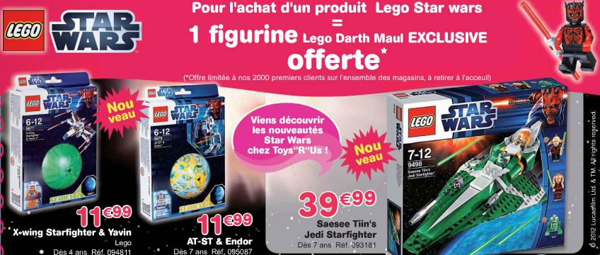 Patience est mère d'économies dans le monde du LEGO. Et Toys R Us va faire quelques heureux avec une promotion valable du 28 mai au 17 juin 2012 qui vous permettra d'obtenir la minifig exclusive de Darth Maul en polybag (6005188) distribuée lors de la dernière New York Toy Fair 2012.