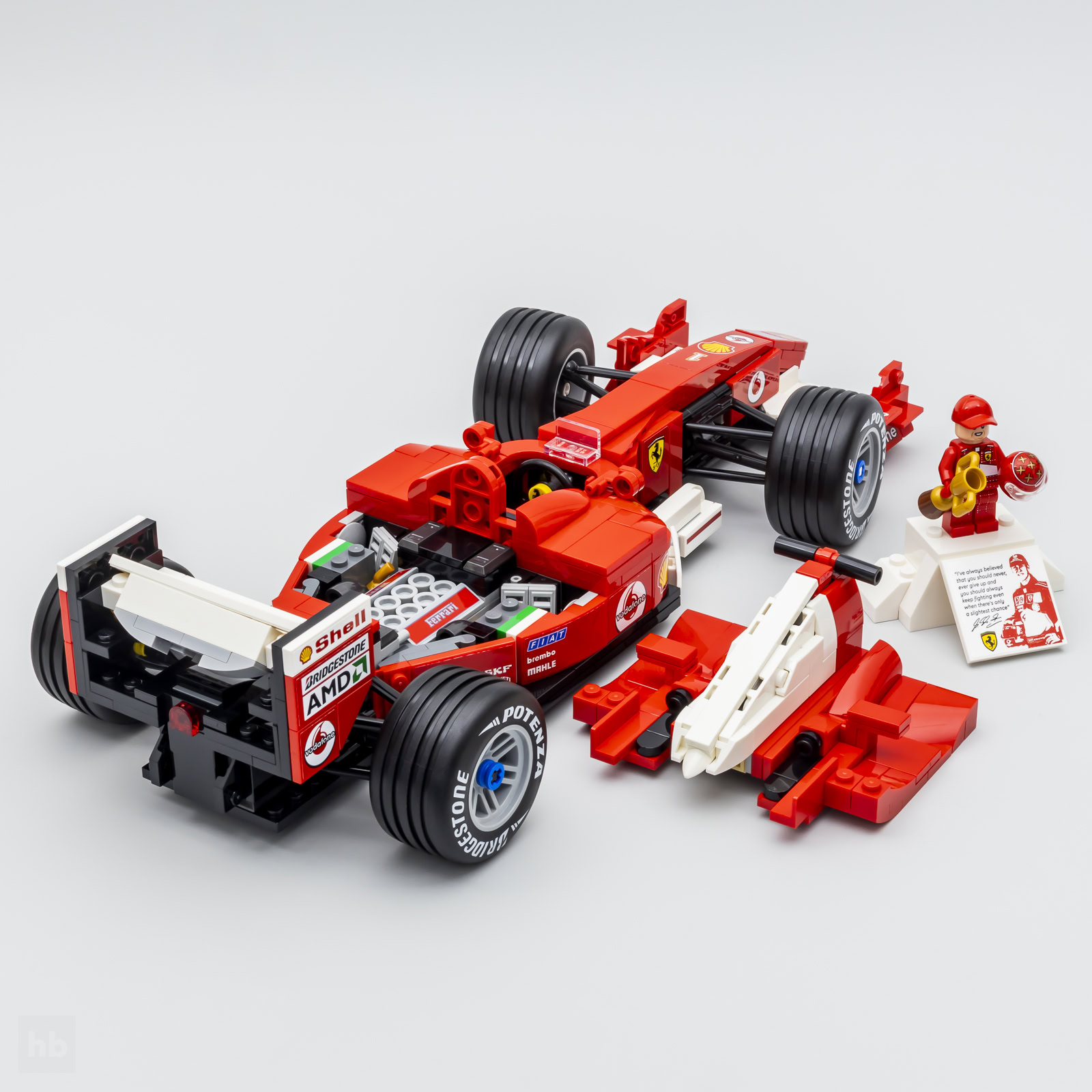 Comme pour les deux autres monoplaces, l'inventaire réduit de cette boite, sachant qu'un certain nombre d'éléments passent dans le podium qui permet d'exposer la minifig de Michael Schumacher ainsi que dans le présentoir prévu pour exposer la monoplace dans une configuration avantageuse, pourrait laisser supposer une expérience d'assemblage et un rendu au rabais mais il n'en est rien.