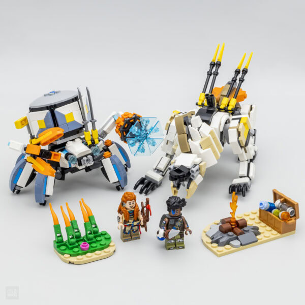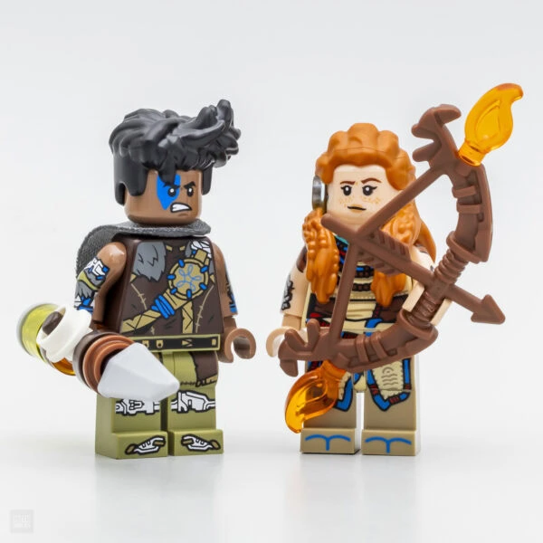 Une fois évacué le contenu à base de briques, il reste les deux figurines fournies. Celle d'Aloy est inédite sous cette forme avec quelques subtiles différences esthétiques face à la figurine livrée dans le set 76989 Horizon Forbidden West Tallneck. Tous les éléments de cette nouvelle version du personnage, sauf la coiffure commune aux deux sets, sont des références inédites. L'arc est lui aussi un nouvel élément conçu pour ressembler à celui vu dans le jeu, l'accessoire peut accueillir les différents boosts fournis.