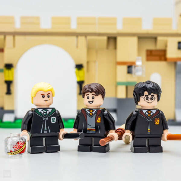 Les trois étudiants logiquement en version première année avec jambes courtes et fixes, (Harry Potter, Neville Londubat et Drago Malefoy) sont équipés de pièces déjà vues à de multiples reprises au sein de la gamme Harry Potter. On sent une fois de plus la volonté de limiter les frais avec des jambes neutres pour tout le monde.