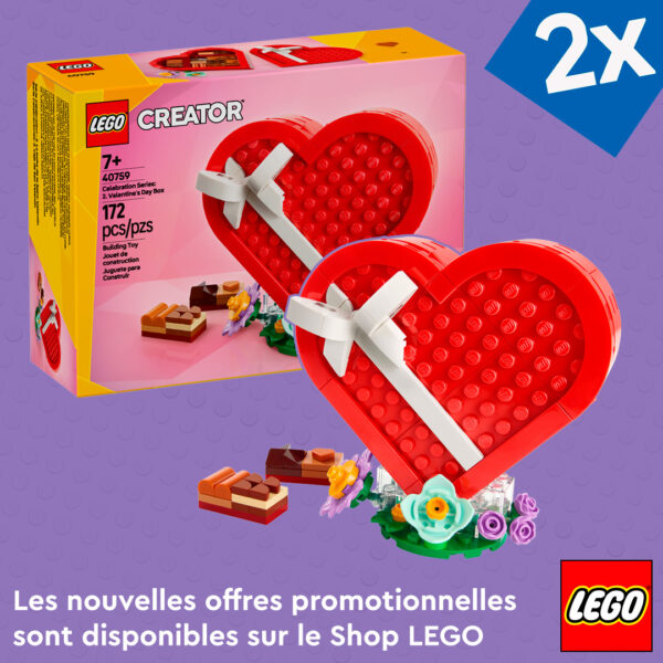 En avant pour une nouvelle offre promotionnelle disponible à compter d'aujourd'hui sur la boutique officielle en ligne ainsi que dans les LEGO Stores avec le set LEGO 40759 Celebration Series : 2. Valentine's Day Box qui est offert dès 75 € d'achat sans restriction de gamme.