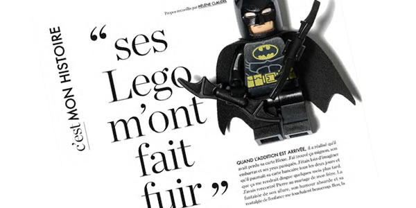 A lire sur le site du magazine Elle, une histoire racontée par une femme qui décrit par le menu sa rencontre avec un AFOL manifestement adepte de la réalisation de brickfilms et qui nous explique comment elle a fini par tout envoyer paître avant de terminer sur une conclusion à l'ambiance cinématographique où tout est bien qui finit bien : L'AFOL est guéri, il a grandi, il a pris sa vie en main, etc...