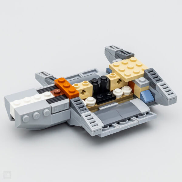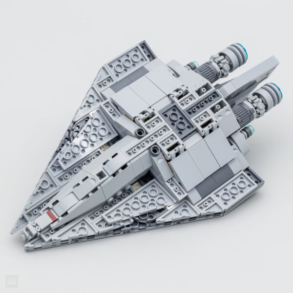 La surface supérieure du vaisseau conserve un bon équilibre entre tenons apparents et surfaces lisses, les angles sont bien gérés avec très peu d'espaces vides notamment entre les ailes et la partie centrale du fuselage et le greebling (l'art d'intégrer des détails à l'aide de petits éléments) souvent à base de patins à roulette est très à-propos.