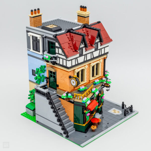 La variété des textures et des coloris utilisés pour les murs de la construction contribue à offrir une expérience d'assemblage vraiment satisfaisante. Ce Modular n'est pas sur une thématique unique même si on peut lui accorder le style "Tudor" pour le bâtiment principal et on passe avec plaisir d'un univers à l'autre au fil des étapes du livret. À l'arrivée on obtient deux constructions collées l'une à l'autre avec leurs particularités architecturales et leur identité.