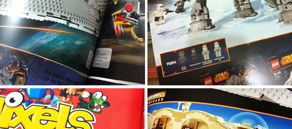On y découvre les minifigs du set 75051 Jedi Hunter (dont JEK-14), ainsi qu'un aperçu des sets 75052 Mos Eisley Cantina, 75054 AT-AT et 75055 Imperial Star Destroyer. A voir également, la série 3 de sachets de la gamme LEGO Mixels et dans un coin sur la page de l'AT-AT, le Ghost du set 75053.