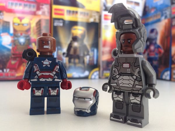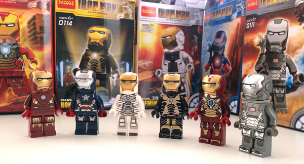 Decool, en commercialisant certains produits dont les versions Mark 39 Gemini (3ème en partant de la gauche) et Mark 41 Bones (4ème en partant de la gauche) de l'armure d'Iron Man que LEGO ne produit pas, devient donc un vendeur de minifigs customs comme les autres, qui produit ses propres minifigs...