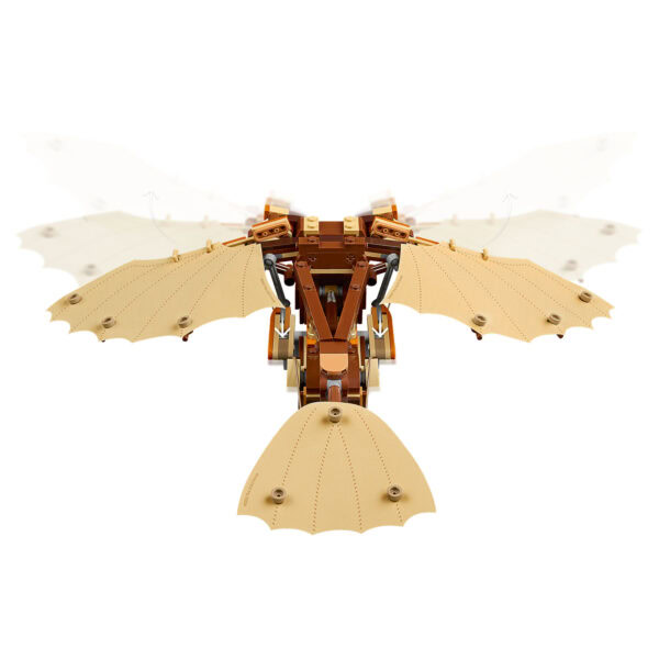 Dans la boite, de quoi assembler une maquette de 25 cm de haut, 29 cm de long et 35 cm de large du célèbre ornithoptère avec son, présentoir, le tout étant accompagné d'une minifig de son créateur.