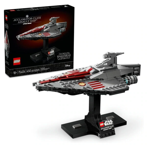 Toujours en provenance de la version mexicaine d'Amazon, on obtient également aujourd'hui les premiers visuels officiels du set LEGO Star Wars 75404 Acclamator-Class Assault Ship, une boite de 450 pièces attendue en rayon dès le 1er janvier 2025 à un prix public qui devrait être fixé à 49,99 € ou 59,99 €.