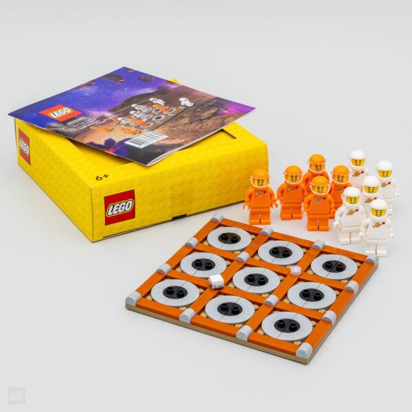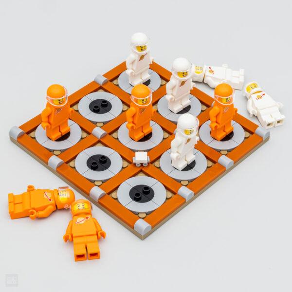 On ne va pas se mentir, pour 16 €, on achète surtout les dix minifigs fournies et le "jeu" de morpion proposé n'est qu'un prétexte pour accumuler quelques astronautes Classic Space en deux coloris. Le plateau de jeu basé sur une plaque de base 16x16 en Dark Tan est vite assemblé, il est fonctionnel avec ses tenons apparents qui permettent de placer les figurines et vous pouvez éventuellement remplacer les 10 minifigs fournies par celles que vous voulez. Le plateau est agrémenté d'un micro-véhicule qui déambule entre les cratères, c'est mignon.