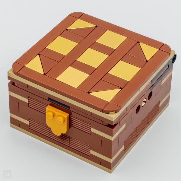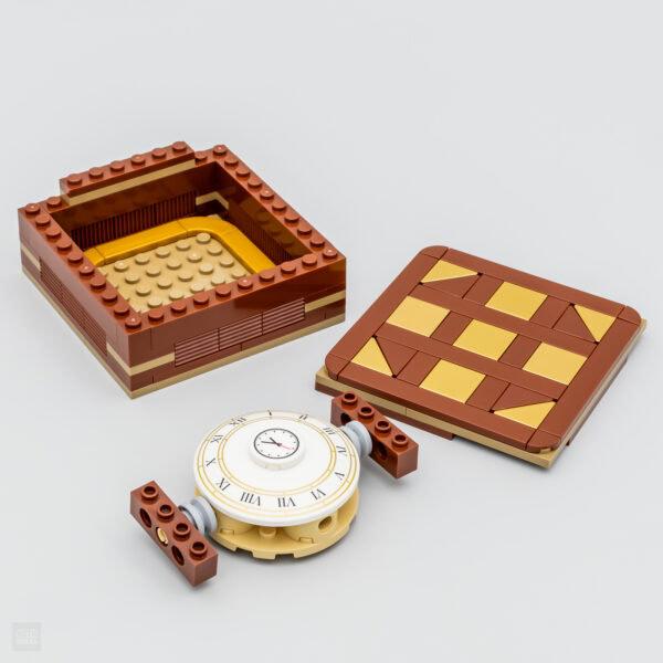 LEGO reprend ici le principe du chronomètre de marine à suspension avec son coffret en bois mais oublie de nous fournir les deux poignées latérales qui auraient permis d'obtenir une finition largement plus aboutie. Dommage, sachant que l'objet dispose de deux points de fixation sur les flancs qui restent bien visibles.
