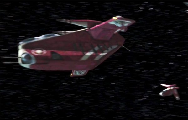Ce Coruscant Guard Gunship est en effet inspiré de la très brève apparition du vaisseau à l'écran dans le 7ème épisode la 6ème saison de la série animée The Clone Wars, la capture ci-dessous étant sans doute la meilleure vue disponible sur cette canonnière (0:52 dans l'épisode concerné).