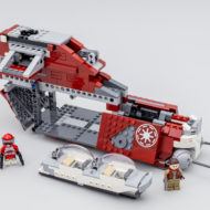 Jouet destiné à être manipulé oblige, la structure interne du vaisseau est constituée d'une armature à base de poutres Technic qui garantit la nécessaire solidité de la construction. C'est bien conçu, plaisant à assembler et le jouet a fière allure. Les deux cockpits peuvent accueillir des minifigs qu'il faudra légèrement allonger pour que les casques ne viennent pas buter sur les deux verrières, l'échelle du vaisseau est évidemment réduite pour en faire un produit facilement manipulable et le designer a également intégré une poignée de transport qui retombe dans les entrailles de l'engin lorsqu'elle n'est pas utilisée et qui sait donc se faire relativement discrète.