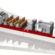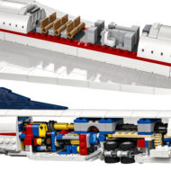 Les lignes principales du vaisseau sont en effet bien là, mais de nombreux détails passent à la trappe ou sont ultra-simplifiés, sans doute pour respecter les contraintes d'inventaire et de tarif du produit. Les coloris utilisé sur la version LEGO ne sont en revanche pas les bons, et c'est dommage. le vaisseau vu à l'écran est gris avec des accents de bleu, il n'est pas blanc, et LEGO ne nous propose pas de trains d'atterrissage ni d'intérieur correctement aménagé ou d'échelle d'accès au compartiment central, cette dernière étant vaguement incarnée par un autocollant.