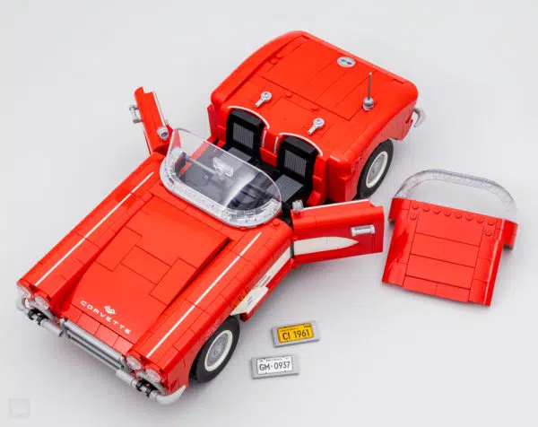 On s'intéresse aujourd'hui rapidement au contenu du set LEGO ICONS 10321 Corvette, une boite de 1210 pièces qui sera disponible via la boutique officielle en ligne et dans les LEGO Stores dès le 1er août 2023 au prix public de 149.99 €. Vous le savez déjà depuis l'annonce officielle du produit, il s'agit ici d'assembler une reproduction de la version C1 de 1961 de la Corvette Chevrolet, avec ses quatre feux arrières qui replaçaient alors les deux optiques installées sur les ailes, son moteur V8 à soupapes en tête et son hardtop.