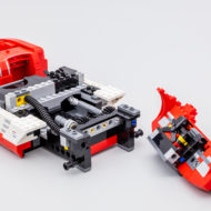 Les portières sont en revanche bien conçues, elles font appel à deux éléments inédits qui permettent de reproduire plutôt fidèlement la zone blanche, en retrait d'une demi-tenon sur le modèle LEGO, présente sur les flancs du véhicule de référence. La sellerie est d'une relative simplicité mais c'est suffisant et bien exécuté, tout comme le poste de conduite avec son compteur, ses pédales et son levier de vitesses.