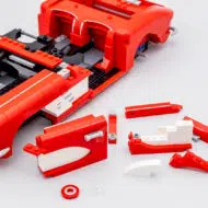 Le solide plancher du véhicule est comme souvent constitué de quelques Plates et autres poutres Technic, on vient ensuite y fixer les différents éléments de carrosserie ainsi que les équipements intérieurs. C'est rapidement assemblé et se rend immédiatement compte que les visuels officiels retouchés nous promettaient une teinte un peu plus foncée que dans la réalité. Cette Corvette C1 est rouge vif, j'aurais pourtant tenté le Dark Red (rouge foncé) histoire de lui donner un peu plus de cachet au risque d'avoir affaire aux habituels écarts de teinte.