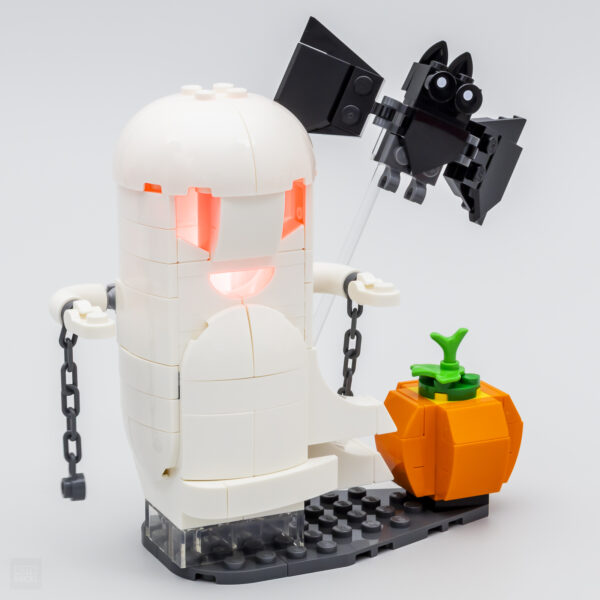 Le fantôme est comme en lévitation grâce à l'utilisation de quelques briques transparentes, il est accompagné d'une citrouille et d'une chauve-souris installée sur une tige transparente. Pas de quoi se lever la nuit si vous n'avez rien de précis à acheter au prix fort sur la boutique officielle en ligne en ce moment.