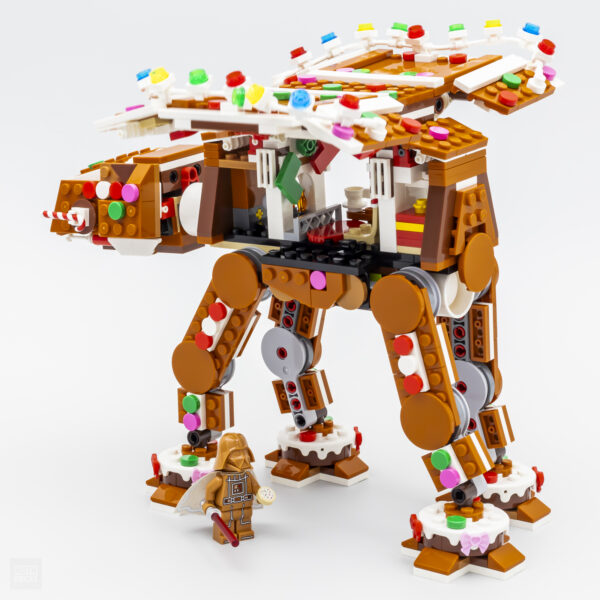 Le look pain d'épices est d'ailleurs un peu gâché par la présence de pièces grises sur l'intérieur des pattes, on dirait presque que l'AT-AT est recouvert d'une couche marron plus qu'il n'est vraiment en pain d'épices. la lisibilité globale est un peu affectée par la présence des éléments colorés décoratifs, mais c'est aussi le propos de ce type d'exercice.