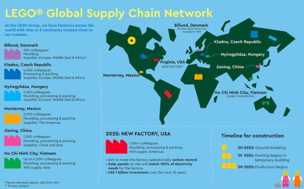 LEGO annonce aujourd'hui la construction et la mise en route d'ici à 2025 d'une nouvelle unité de production, la 7ème au monde, aux États-Unis et plus précisément dans le Comté de Chesterfield en Virginie. Les travaux démarrent cette année.