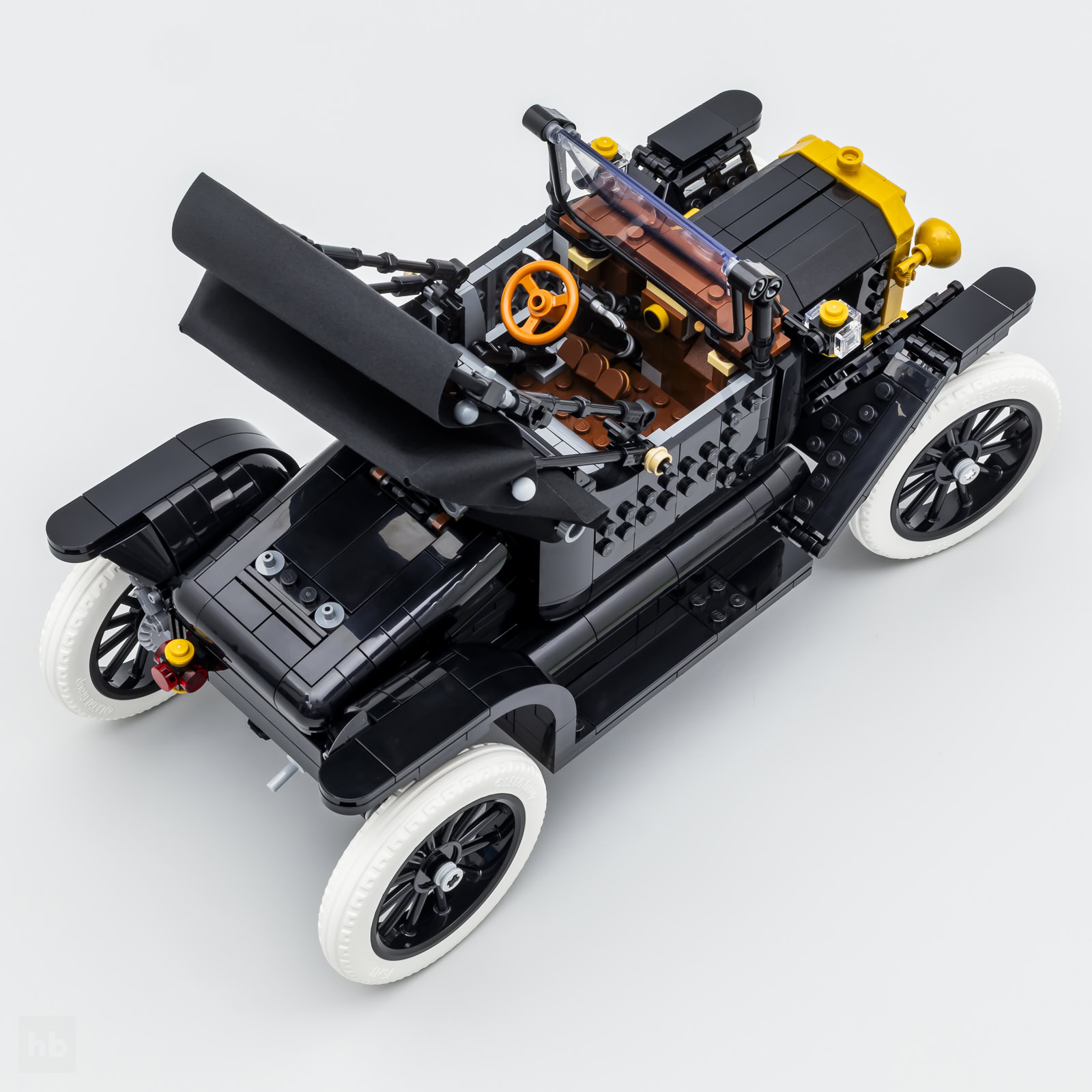 Jusqu'ici tout va bien et j'ai volontairement omis de mentionner la possibilité de rabattre la capote du véhicule parce que c'est le point noir de ce produit haut de gamme vendu 130 €. LEGO ne s'est pas encombré l'esprit en essayant de proposer quelque chose de convaincant pour cet élément du véhicule et il faut donc se contenter d'un consommable aussi fin que du papier.