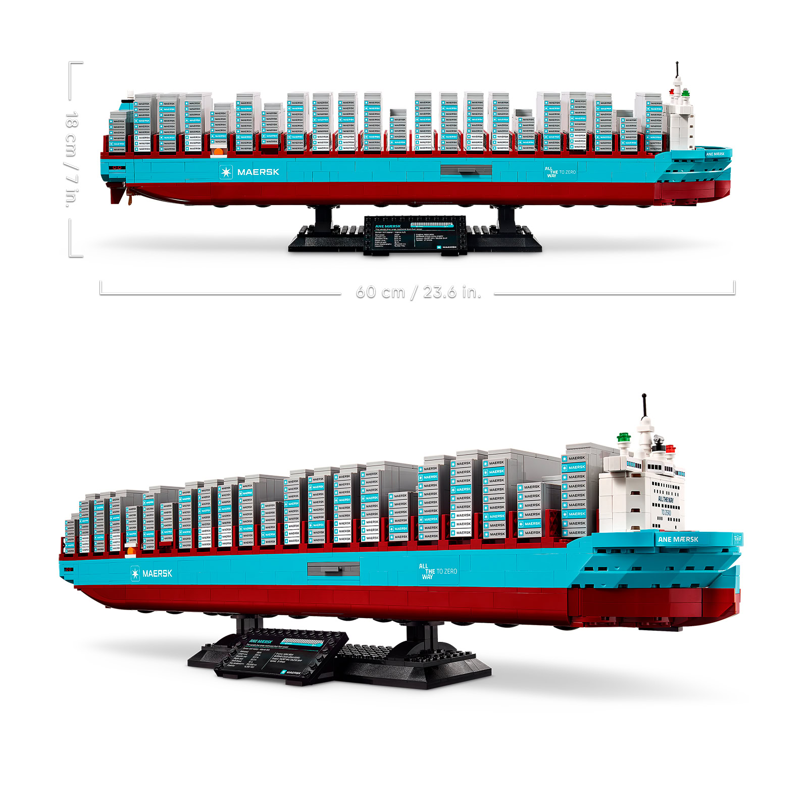 La version LEGO mesure 60 cm de long sur 18 cm de haut et à la différence du porte-conteneurs de 2014 et même si cette nouveauté fait appel à une grosse poignée de stickers, le logo Maersk présent sur le flanc des conteneurs est ici tampographié.