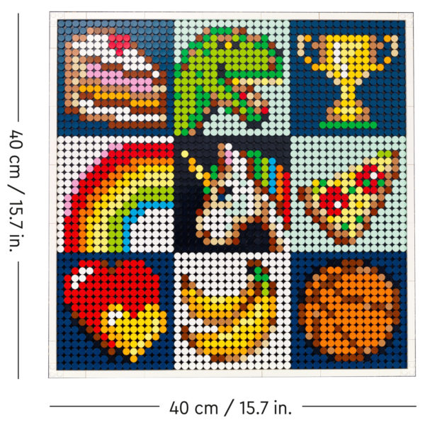 Au-delà de ce que propose cette nouvelle référence de la gamme LEGO ART sur le plan "artistique", c'est surtout la possibilité de partager la construction à plusieurs qui est mise en avant par LEGO, avec 9 livrets d'instructions séparés regroupant 36 possibilités réparties en quatre thèmes, la nourriture, les motifs, les icônes et les hobbies. Le produit offre donc de quoi s'amuser un peu en famille ou entre amis avec un challenge de construction suffisamment accessible aux plus jeunes ou aux moins expérimentés. Chacun pourra construire une des 9 plaques 16x16 fournies avant de regrouper ces éléments pour former une mosaïque à accrocher au mur.