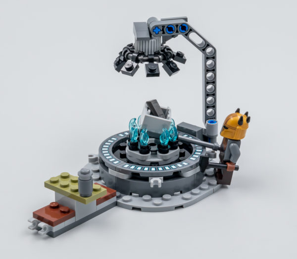 On retrouve bien les éléments vus à l'écran avec le foyer central, l'enclume qui permet de travailler le Beskar et deux bouts de murs qui tentent de recréer l'ambiance de la forge. C'est minimaliste mais il était de toute façon illusoire d'imaginer un espace entièrement fermé. Dommage pour les trois lingots qui incarne les blocs de Beskar, un élément tampographié ou même un simple sticker à coller sur une Tile aurait été apprécié, surtout dans un set dont l'action ne tourne qu'autour de la fonte et du travail de ce métal précieux.