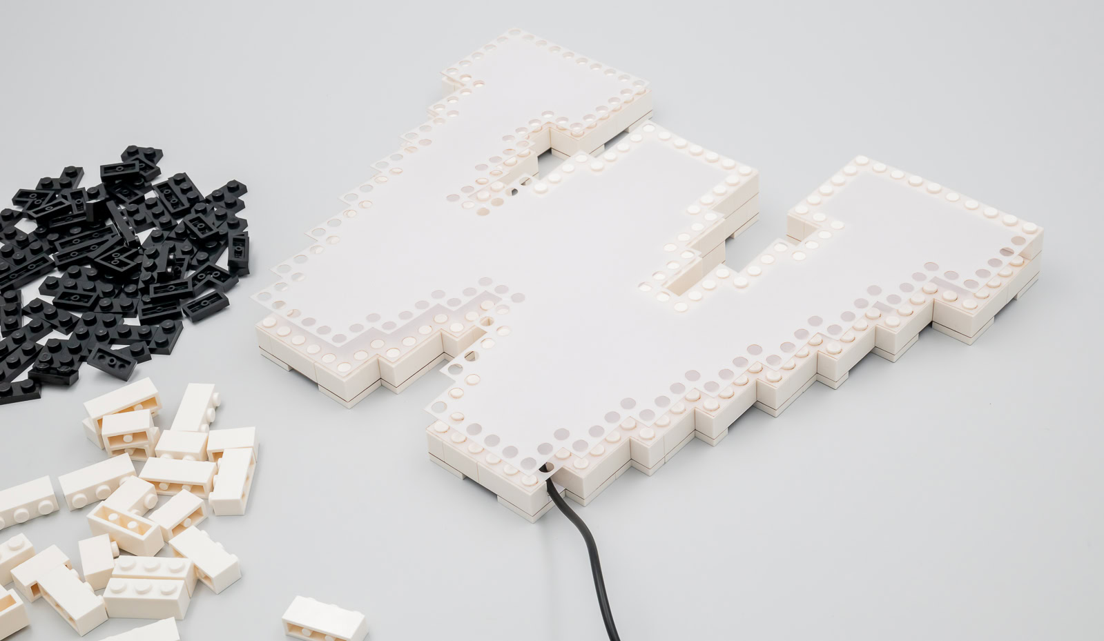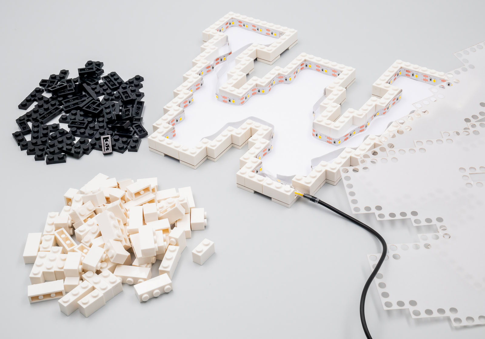 Le produit de 22 cm de haut et d'une largeur variable selon la lettre concernée est constitué de plusieurs rangées de briques LEGO au milieu desquelles sont insérées des feuilles cartonnées qui diffusent et tentent d'uniformiser la lumière générée par le bandeau LED qui circule le long de la structure interne. Les pièces utilisées sont bien des éléments officiels LEGO, elles sont neuves et elles ne sont pas collées entre elles.