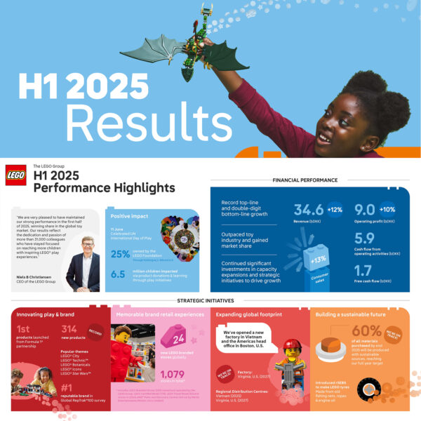 LEGO publie aujourd'hui ses résultats financiers intermédiaires pour le premier semestre 2025 et la comptabilité du fabricant confirme une croissance en hausse avec une augmentation de 12 % de son chiffre d'affaires ainsi qu'un volume de vente qui progresse de 13 % par rapport à la même période en 2024. Le résultat d'exploitation enregistre une hausse de 10 % et le bénéfice net affiche de son côté une hausse de 10 % sur la période.