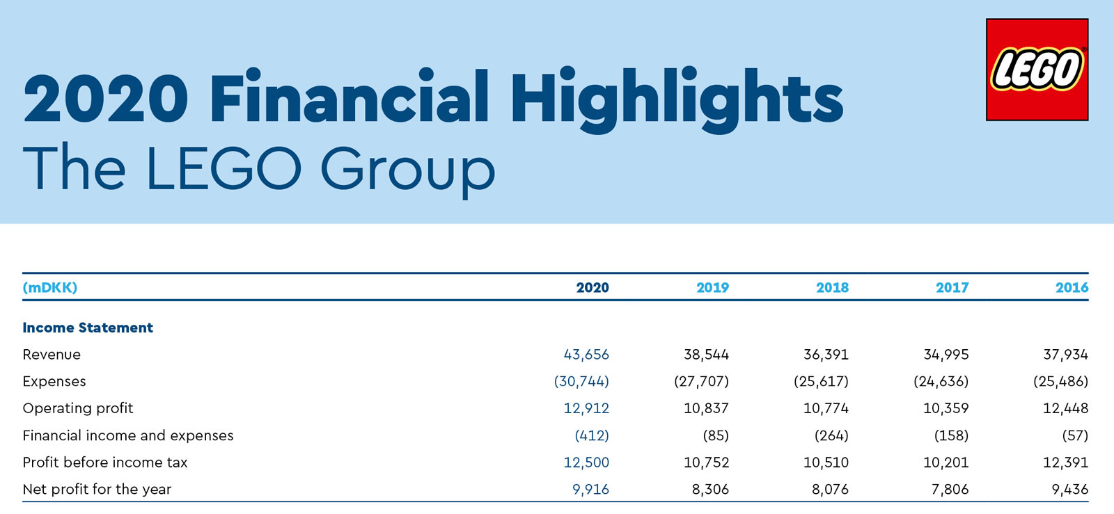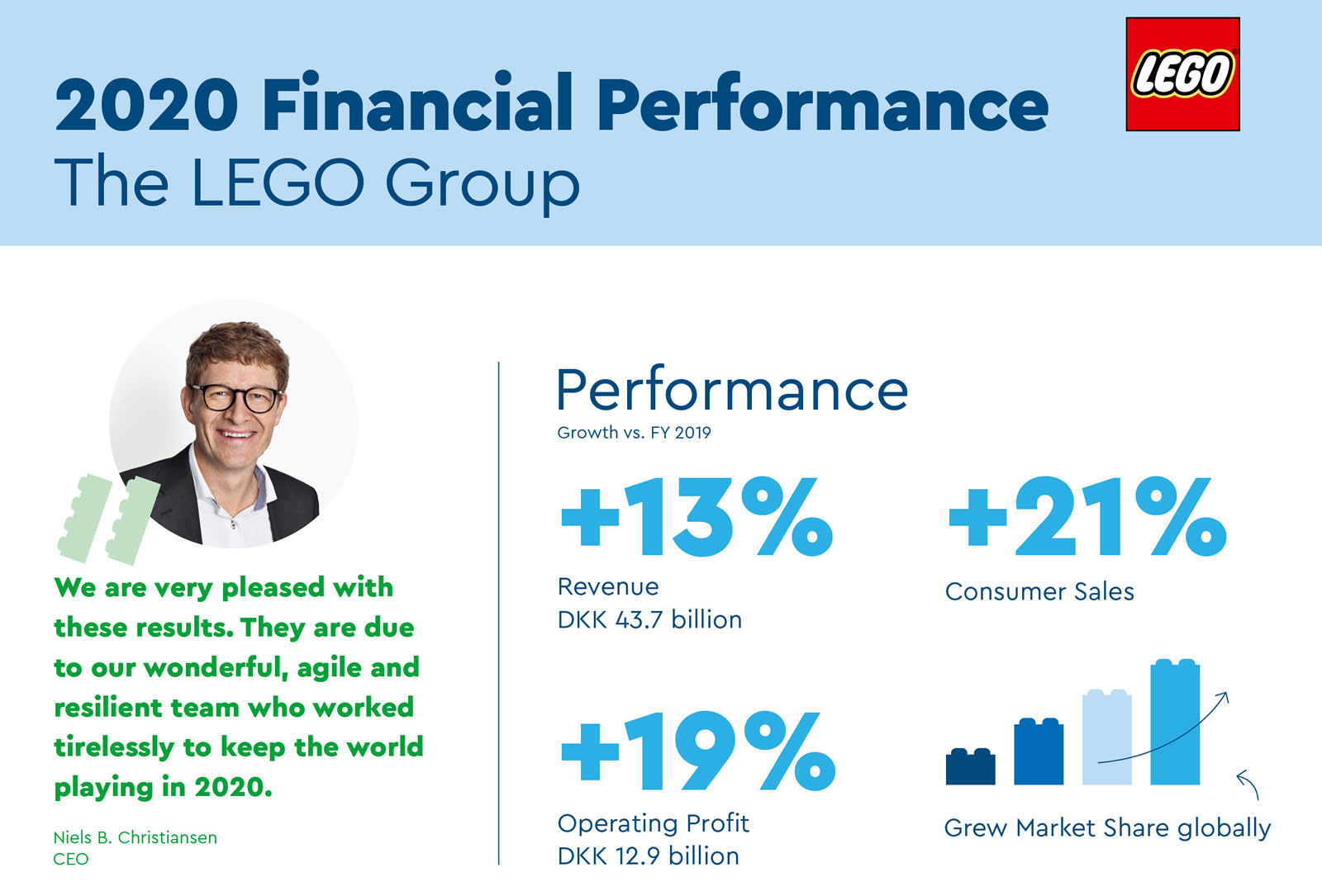 LEGO annonce une augmentation de 13 % de son chiffre d'affaires et un volume de vente en croissance de 21% sur tous les marchés où la marque est présente. Le résultat d'exploitation enregistre de son côté une augmentation de 19% et le bénéfice net augmente de plus de 19% par rapport à l'année 2019.