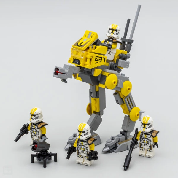 On pourrait débattre du choix de la couleur jaune pour la carrosserie de cet AT-RT, c'est raccord avec la teinte utilisée ici pour les armures des Clones mais c'est sans doute un peu trop flashy pour vraiment coller au look des soldats de la 327th Star Corps. Le designer à choisi d'intégrer un Stud-Shooter à l'avant de l'engin et cette intégration est loin d'être discrète. On fera avec ou on retirera l'élément.