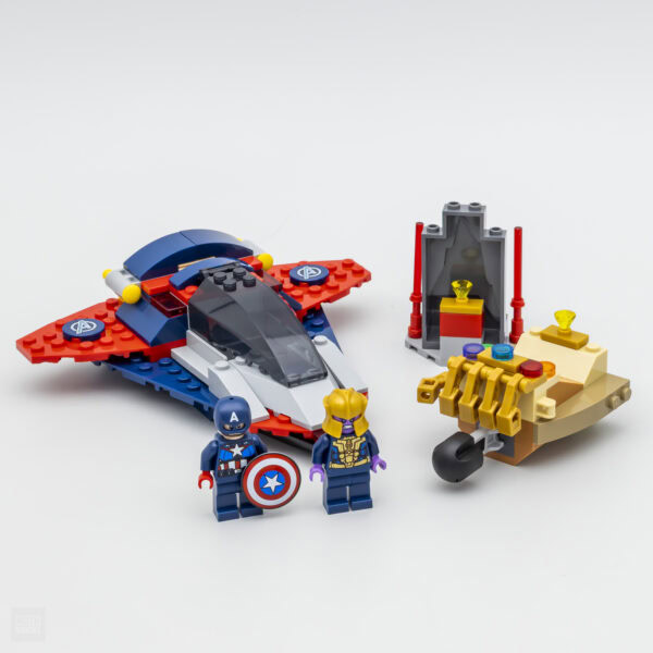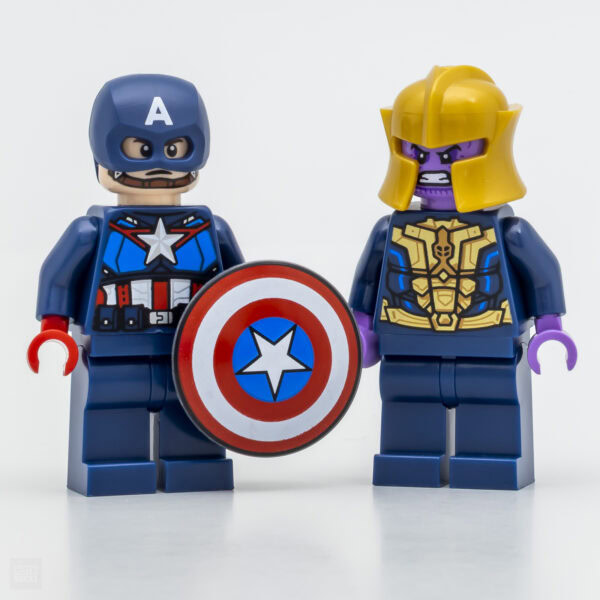 Du côté de la dotation en figurines, on obtient ici deux minifigs : Captain America et Thanos. Le torse de Captain America livré ici est inédit sous cette forme, c'est toujours ça de pris même si la figurine doit se contenter de jambes neutres. La minifig de Thanos est celle vue dans le set 76312 The Hulk Truck vs. Thanos (29,99 €), le casque en plus et les épaulettes en moins.