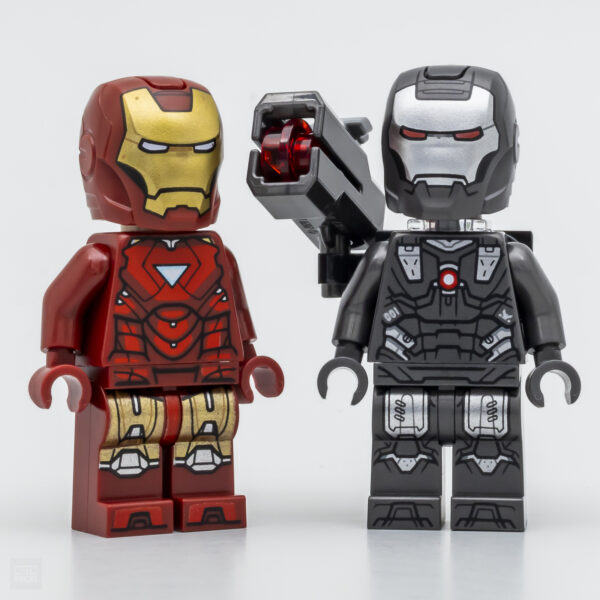 Du côté de la dotation en figurines, on obtient deux minifigs loin d'être inédites : Iron Man et War Machine. L'armure Mark 6 est aussi disponible dans les sets 76313 Marvel Logo & Minifigures (99,99 €) et 76315 Iron Man's Laboratory : Hall of Armor (54,99 €) et War Machine profite du torse déjà vu dans plusieurs boites depuis 2022 mais avec des mains en Pearl Dark Gray, le tout posé sur les jambes déjà vues dans plusieurs sets qui mettent ce personnage en scène depuis 2021.