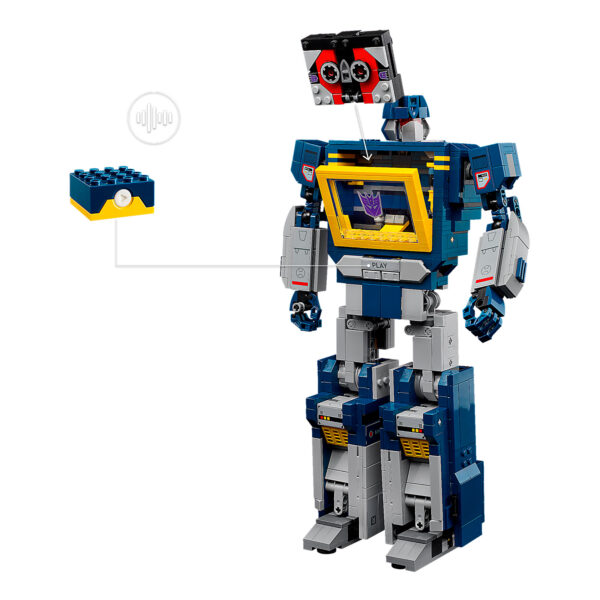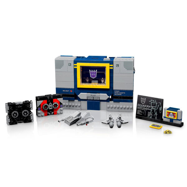 La construction est équipée d'une brique sonore intégrant quelques effets vocaux et il suffira de presser le bouton "play" pour lancer les séquences proposées. Ce Decepticon pourra être converti en radio-cassette sans devoir démonter une ou plusieurs sections. Le produit inclut également une petite plaque de présentation, c'était aussi le cas pour les deux Autobots déjà commercialisés.