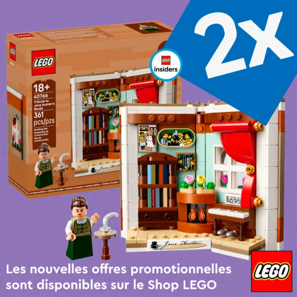 Une fois n'est pas coutume, les planètes s'alignent sur la boutique officielle en ligne avec deux offres promotionnelles intéressantes si vous y avez vos habitudes : les points Insiders sont doublés durant quelques jours et le set 40766 Tribute to Jane Austen's Books y est offert dès 150 € d'achat sans restriction de gamme.