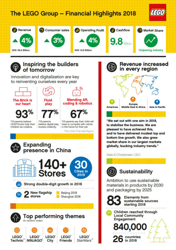 En marge de ces chiffres encourageants qui confirment que LEGO a su sauver son exercice 2018 durant les six derniers mois de l'année après un premier semestre décevant, le fabricant annonce que la croissance est de retour sur l'ensemble des marchés : moins de 10% en Europe de l'Ouest et aux États-Unis mais croissance à deux chiffres en Chine où l'implantation de la marque s'accélère avec 80 ouvertures de boutiques officielles dans 18 villes du pays annoncées en 2019. En comptant les ouvertures déjà réalisées en 2018, la Chine disposera fin 2019 de plus de 140 LEGO Stores répartis dans une trentaine de villes.