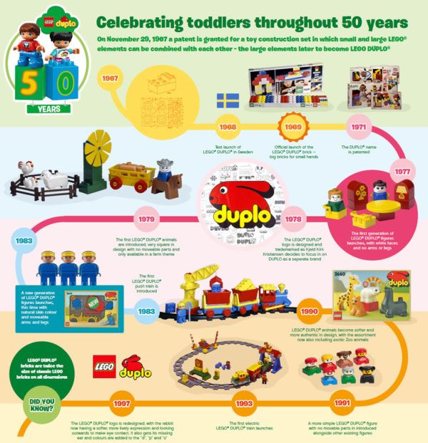 Après les 40 ans de la gamme LEGO Technic, les 60 ans de la brique LEGO et les 40 ans de la minifig, il y a encore un anniversaire à fêter avec les 50 ans de la brique LEGO DUPLO.
