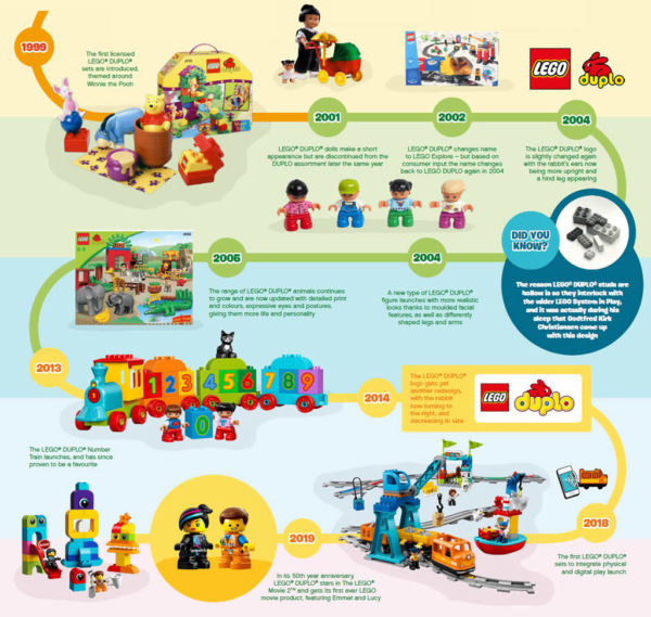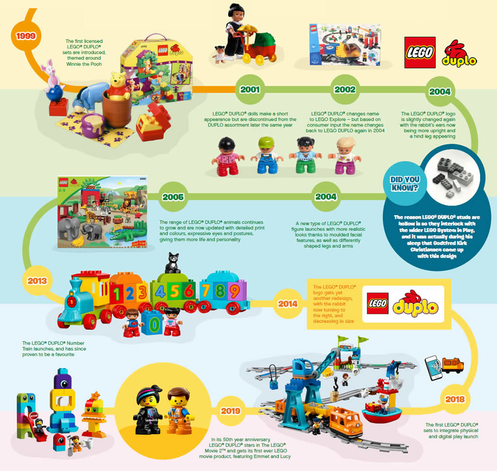 Si vous avez envie de savoir comme tout à commencé et où nous en sommes aujourd'hui, reportez vous à la timeline ci-dessus et ci-dessous qui résume les différentes étapes majeures de l'évolution du concept, avec en fin de parcours l'arrivée des méchants aliens DUPLO au casting du film The LEGO Movie 2. It's all connected.