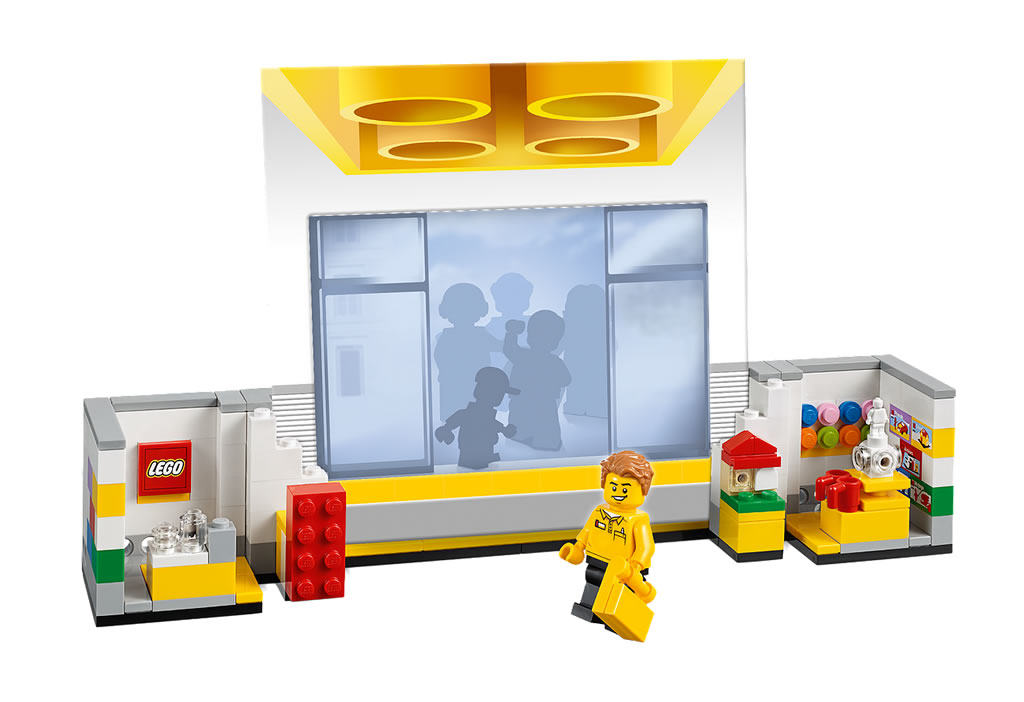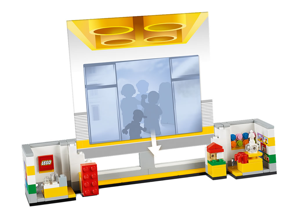 Le logo LEGO placé sur le mur du Store et les visuels des sets sur les étagères de droit sont des stickers comme dans le set 40305 Microscale LEGO Brand Store (24.99 €). On sait maintenant où était parti le vendeur absent du set 40305.