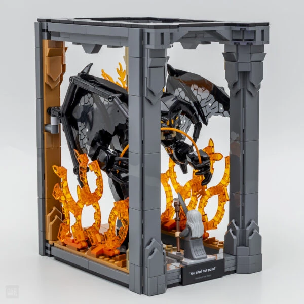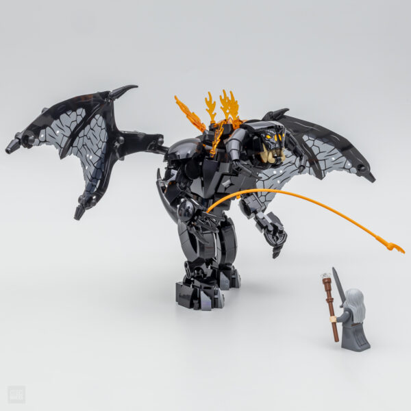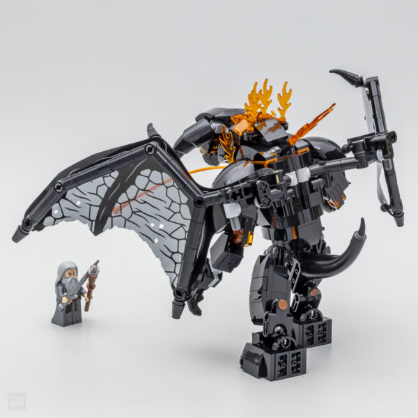 Que dire du Balrog lui-même, si ce n'est que la construction nous renvoie aux pires mechs et autres robots des univers Marvel ou NINJAGO avec une esthétique brouillonne, des rotules et des axes visibles, un amas illisible de pièces Technic dans le dos de la créature et une apparence loin de rendre hommage au sujet traité, surtout dans un set destiné à une clientèle adulte exigeante. Les quelques flammes présente sur le dos de la créature et le "fouet" qu'elle tient dans la main ne sauvent malheureusement pas les meubles.