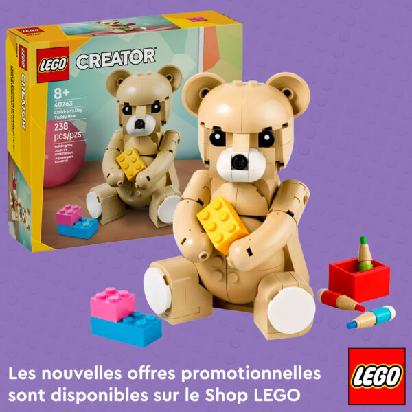 En avant pour une nouvelle offre promotionnelle valable sur la boutique officielle en ligne ainsi que dans les LEGO Stores jusqu'au 31 mai 2025 : le set LEGO Creator 40763 Children's Day Teddy Bear est offert dès 100 € d'achat sans restriction de gamme.
