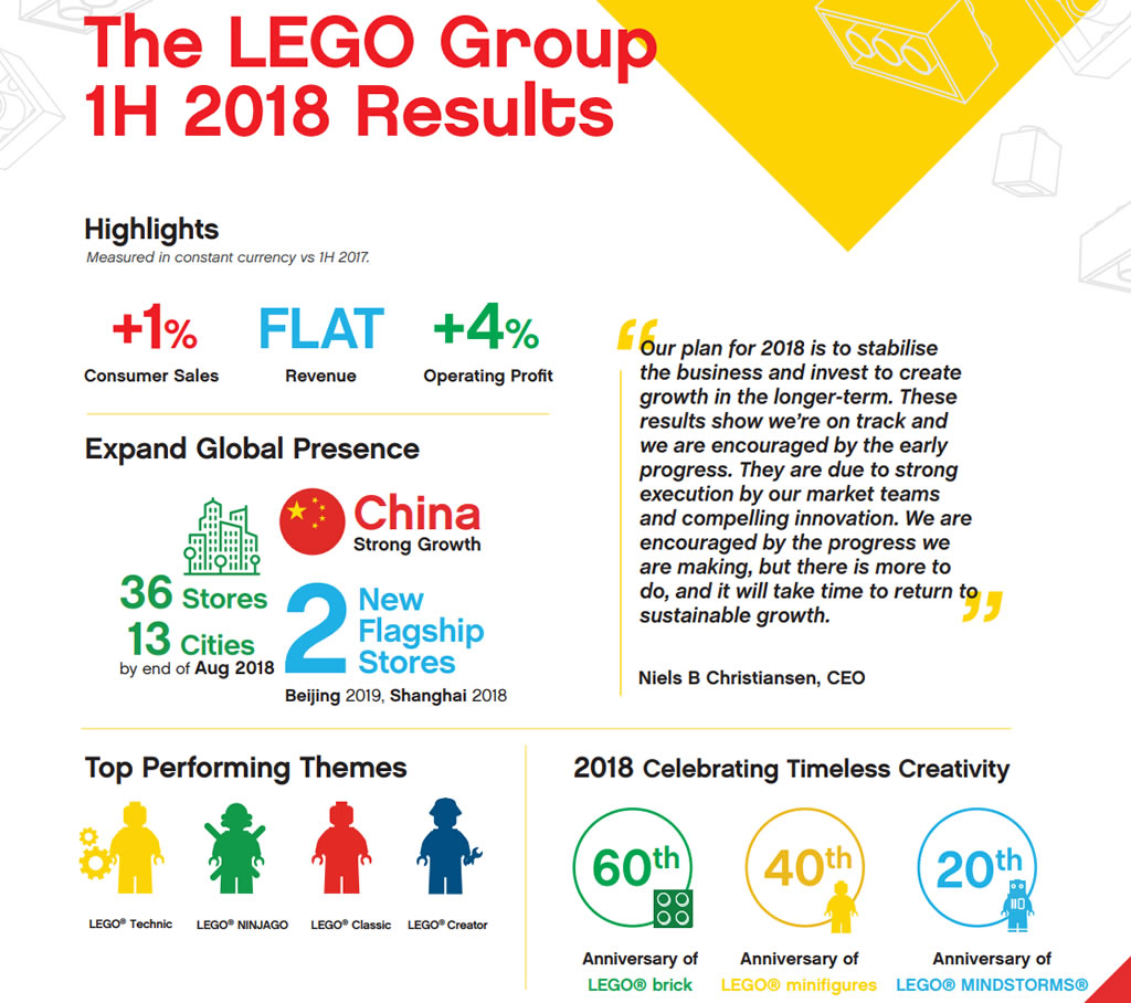 Après une année 2017 qui s'est soldée par une baisse de 5% du CA immédiatement suivie par une vague de licenciements, LEGO publie aujourd'hui ses résultats financiers intermédiaires pour le premier semestre 2018 et met en avant une hausse globale des ventes de 1% pour la période concernée.