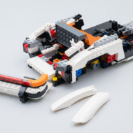 Il n'y a pas de stickers dans cette boite, tous les éléments du tableau de bord, les différentes plaques d'immatriculation ainsi que les marquages utilisés pour identifier les deux véhicules sont tampographiés. Comme souvent, on note quelques variations de teinte entre les différentes pièces qui constituent la carrosserie de la Porsche 911 et si on rajoute l'ombre sur les arêtes de chaque pièce qui renforce l'effet "mur de briques", on se dit que LEGO aurait peut-être dû choisir un autre coloris pour cette 911. Deux des vitres latérales sont aussi tampographiées avec un motif courbe et le blanc utilisé n'est pas vraiment raccord avec celui de la carrosserie.