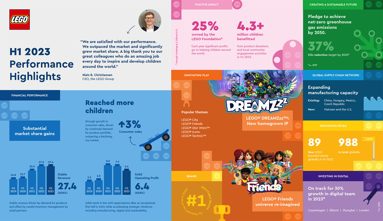 En 2022 sur la même période, LEGO enregistrait une augmentation de 17 % de son chiffre d'affaires par rapport à la même période en 2021 qui établissait déjà des records ainsi qu'un volume de vente en croissance de 13%.