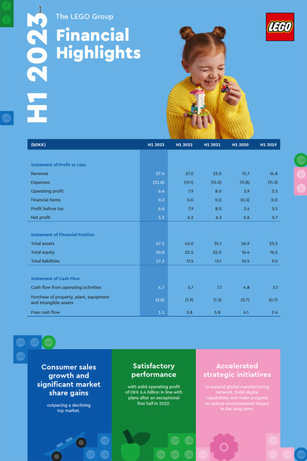 LEGO publie aujourd'hui ses résultats financiers intermédiaires pour le premier semestre 2023 et tous les indicateurs sont une fois de plus au vert même si les chiffres sont moins impressionnants qu'en 2022 : LEGO annonce une modeste augmentation de 1 % de son chiffre d'affaires par rapport à la même période en 2022 ainsi qu'un volume de vente en croissance de seulement 3%.