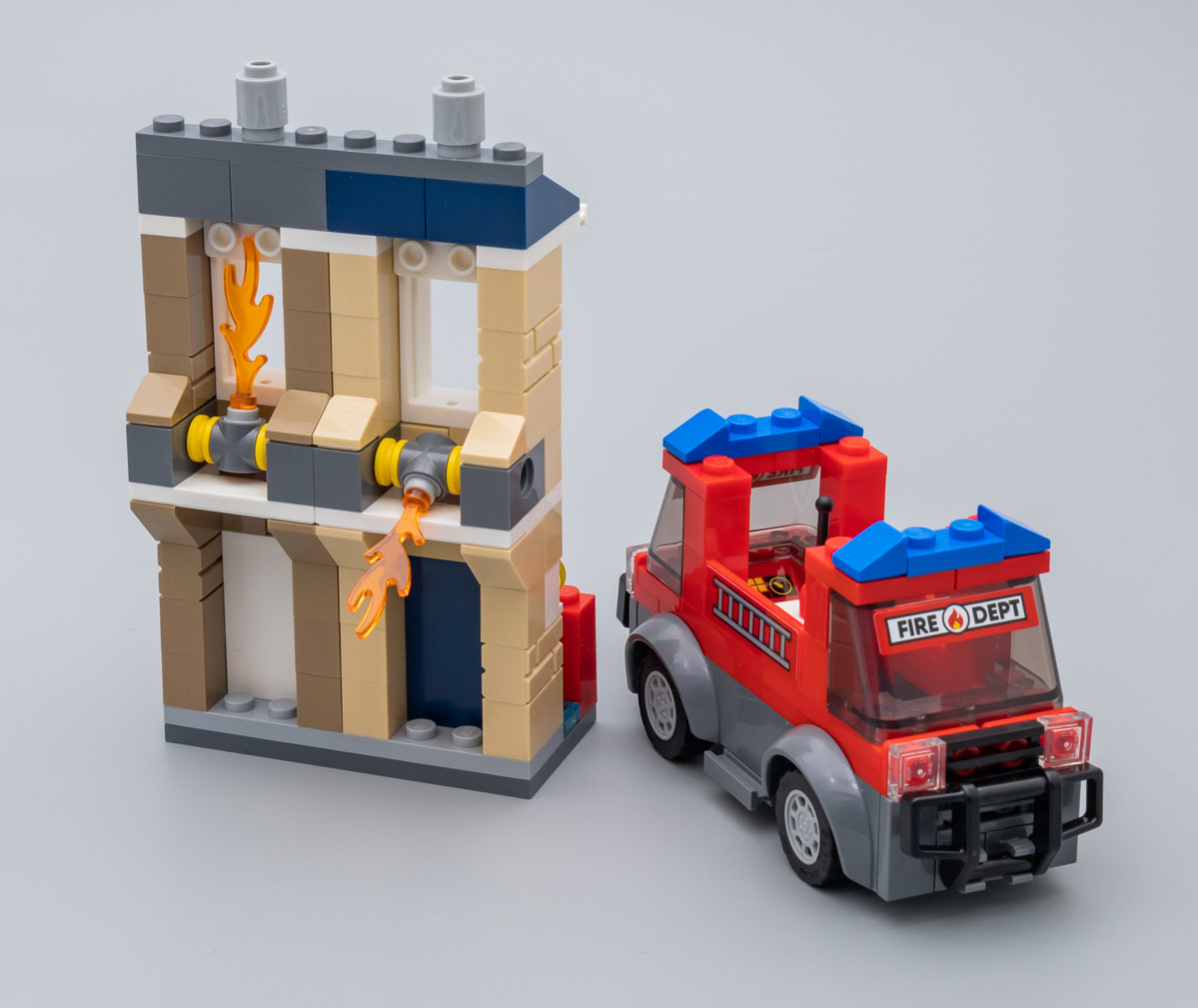 On retrouve donc ici une reproduction du camion de pompiers à emprunter dans les deux sens, ce qui explique la construction un peu étrange du véhicule, et des façades qu'il faut viser. Pour remplacer l'eau, LEGO nous fournit quelques pièces bleues qu'il faut projeter à l'aide d'un Stud-Shooter installé sur une borne à incendie.