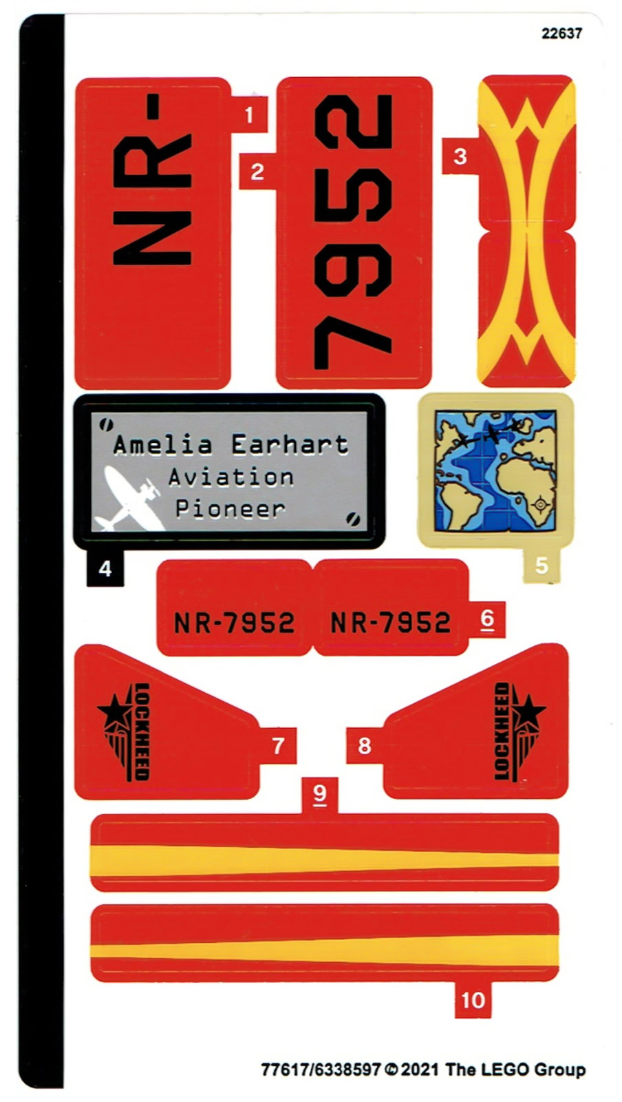 Pour ceux qui se posaient la question et qui n'avaient pas zoomé sur les visuels officiels disponibles depuis quelques jours, il faudra coller une douzaine de stickers sur le modèle : ceux qui prennent place sur la carlingue du Lockheed Vega 5B piloté par Amelia Earhart lors de sa traversée de l'Atlantique en 1932, celui qui rappelle qu'Amelia Earhart est une pionnière de l'aviation sur la petite plaque de présentation et celui qui reproduit la carte que la figurine tient dans la main.
