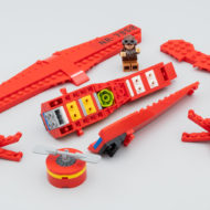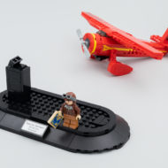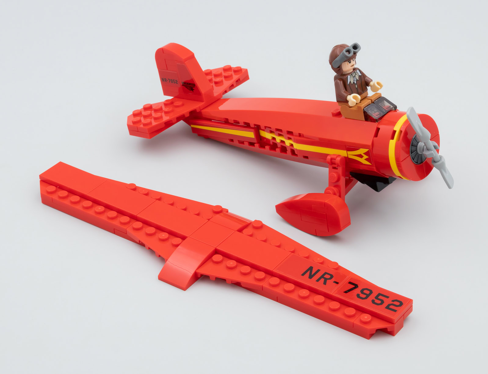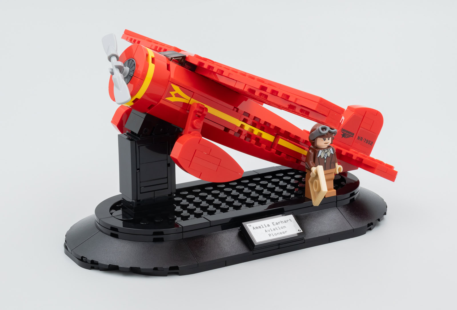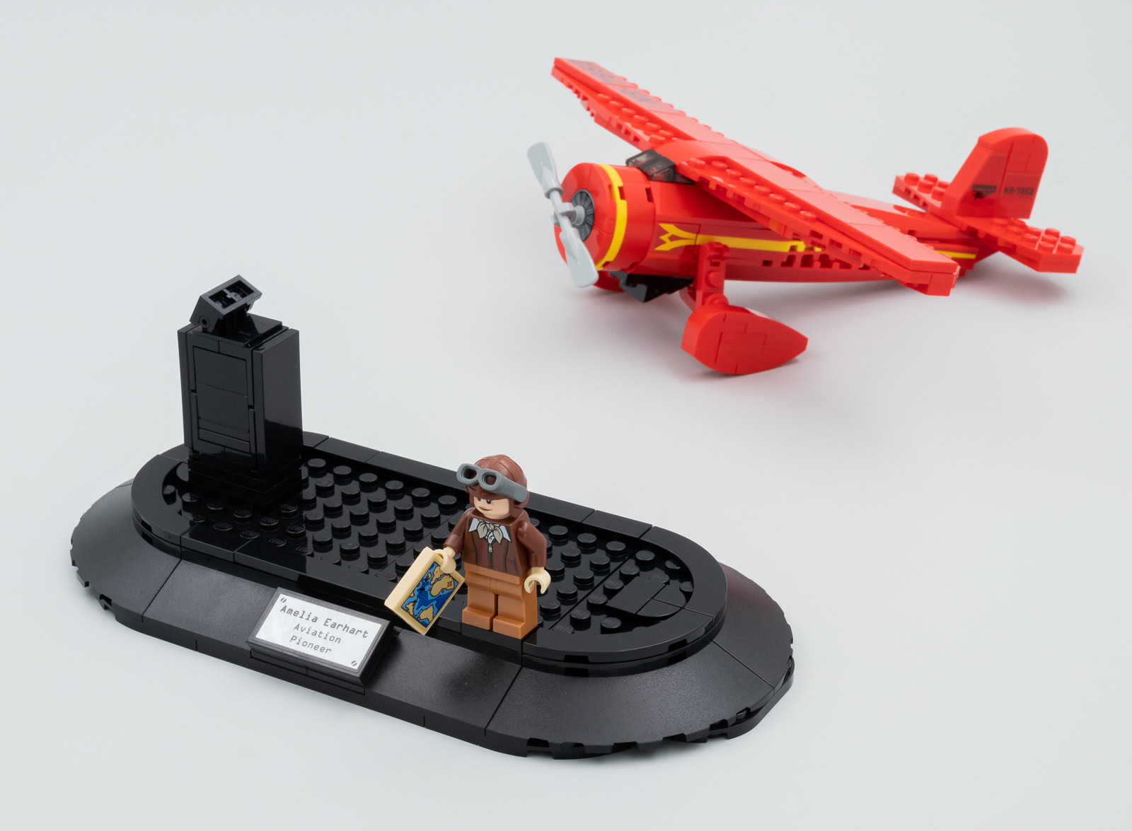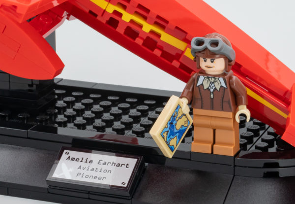 On s'amuse un peu en assemblant la carlingue de l'avion mais la phase de montage est très rapidement expédiée. La minifig d'Amelia Earhart s'inspire de la tenue emblématique de l'aviatrice avec sa veste en cuir et son foulard noué autour du cou. Pas de chevelure, LEGO ne fournit que le casque équipé de lunettes lui aussi emblématique des débuts de l'aviation. Le torse et la tête de la figurine sont des éléments spécialement tampographiés pour cette boite.