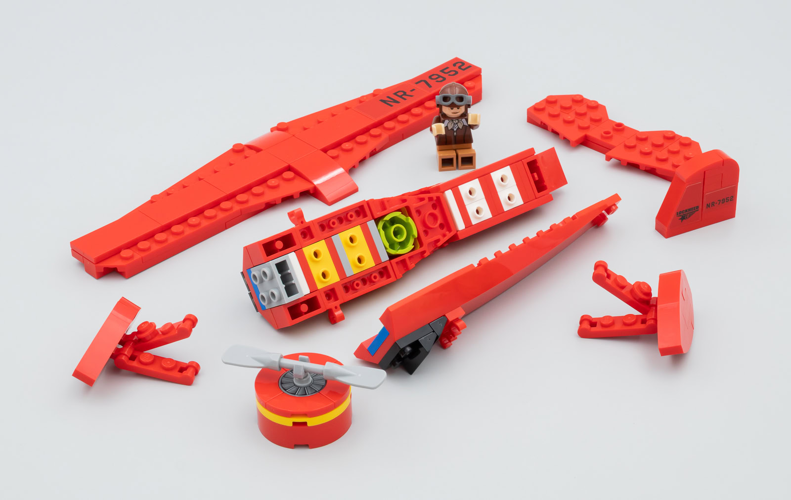 L'avion à construire est un produit d'exposition sans fonctionnalité, ni cockpit, ni parties mobiles à part l'hélice frontale. La minifig fournie ne peut pas être installée aux commandes.
